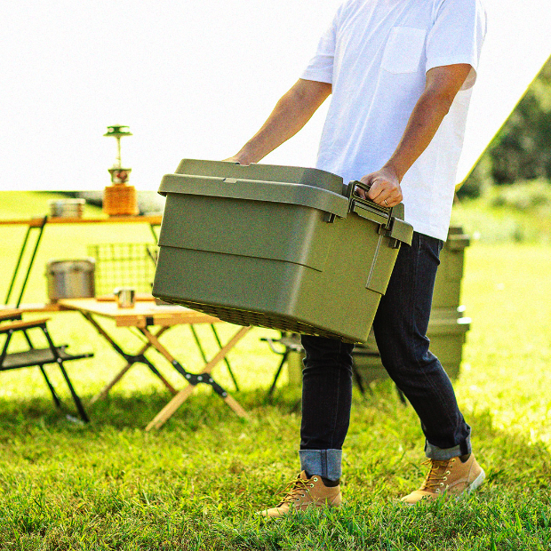 無骨でシンプルなデザインはリビングや寝室などのお部屋にはもちろん、取っ手が付いているから持ち運びにも便利なので車載してアウトドアギアの収納などに使用するなど野外でも活躍間違いなしのアイテムです。