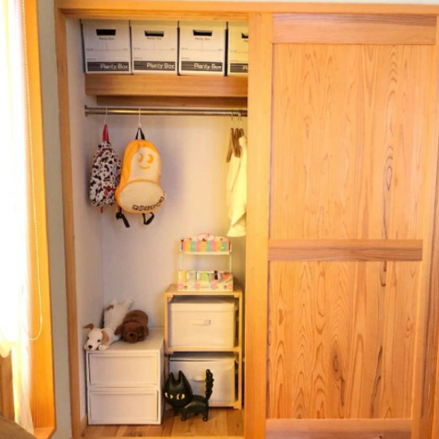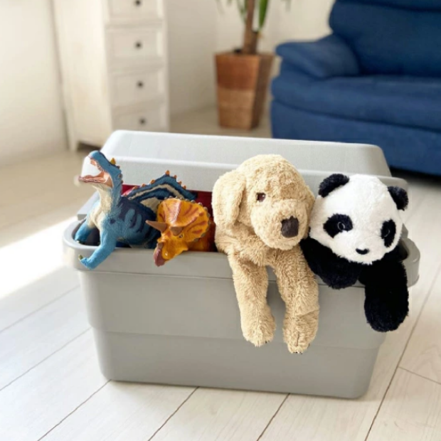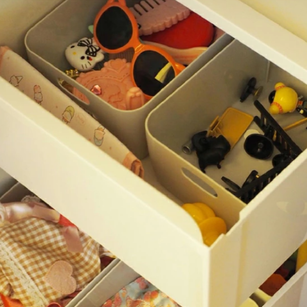 おもちゃなどの細々したアイテムは中にケースを入れて整理。ミニカー・お人形・ゲームなど種類別ごとなどで分類しておけば中のケースごと取り出して遊べて便利です。