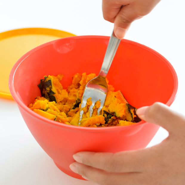 かぼちゃに火が通ったら、フォークの背でつぶします。