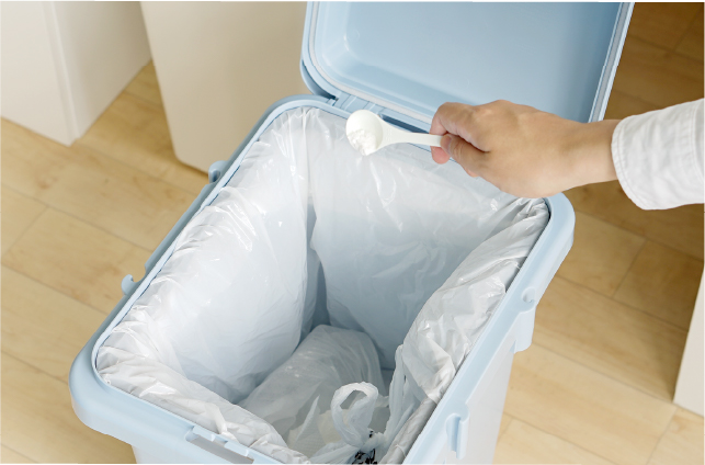ゴミ袋に重曹を少々入れるだけで、 中和作用と静菌作用の2つによって湿気と臭いを軽減させられます!