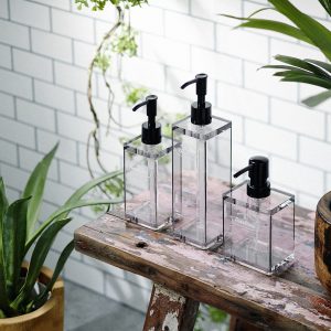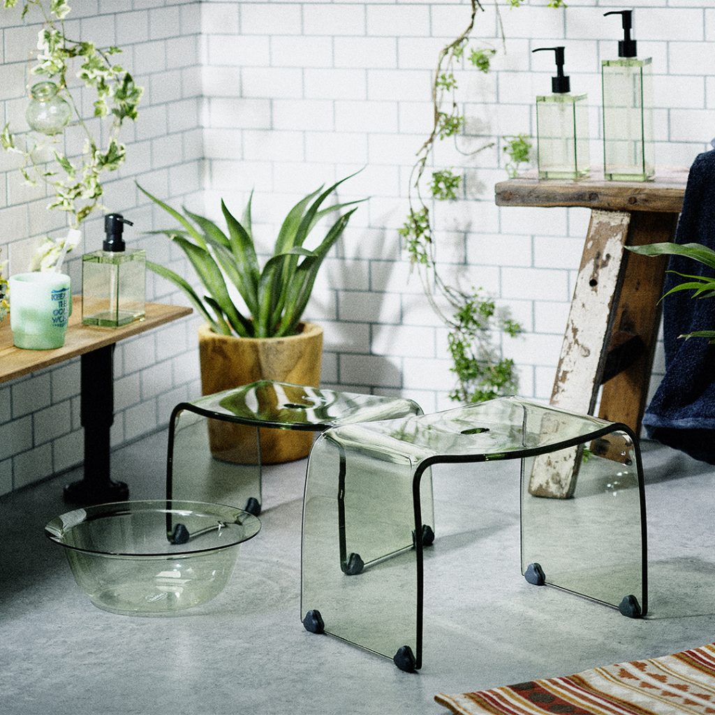 メタクリル樹脂は、高い透明度を誇りながらもガラスに比べて割れにくく、耐久性に優れているため、毎日使うバスグッズに最適な素材と言えます。