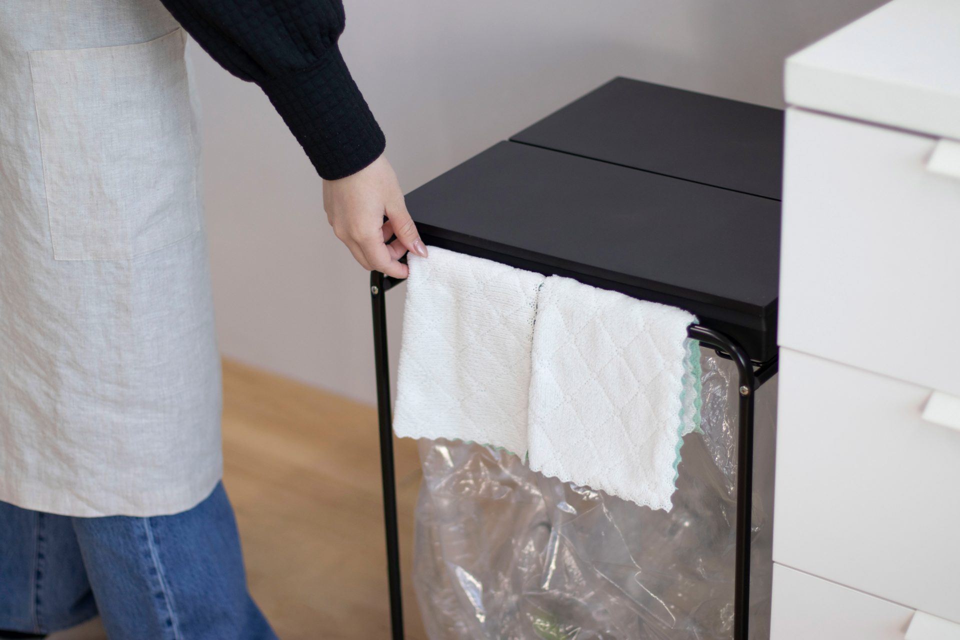 つい汚れがちなゴミ箱をいつでもサッと掃除できるよう、フレームにタオルやクロスがかけられる構造になっております。