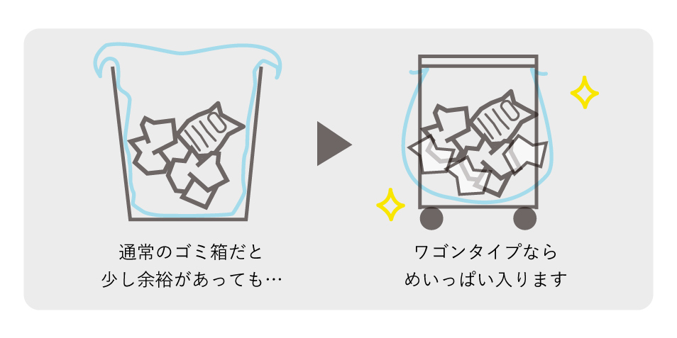 ボックスタイプのゴミ箱だとどうしても袋に余裕があった状態でも交換を余儀なくされてしまいますが、ワゴンタイプならめいっぱいゴミを入れた状態まで袋を活用できます!