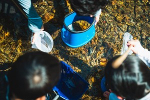 チチコ(カワヨシノボリ)を箱メガネと専用網で捕まえる体験ができます。郡上の子どもたちが受け継いできた伝統的な魚取りです。