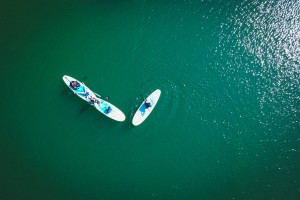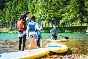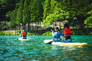 流れが少なく広々とした湖でSUP(サップ)を使い、初心者でもゆったりクルージングを楽しめる。